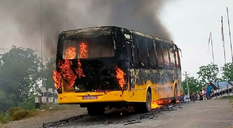 A bus that was on its way to collect school children came under petrol bomb attack on the Dadrahani Bridge at Bharatpur Metropolitan City-20 this morning, police said.Spokesman for the District Police Office Chitwan, Deputy Superintendent Bhesh Raj Rijal said some unknown assailants who came in a group of six threw petrol bomb on the bus (Bagamati Province 06001 Ka 0045) this morning.They ordered the driver and his helper to disembark before hurling the Molotov cocktail on the bus. The bus caught fire due to this and was completely burnt.”Police have initiated investigation into the incident and who threw the petrol bomb and their motive would be known only after this,” DSP Rijal said.