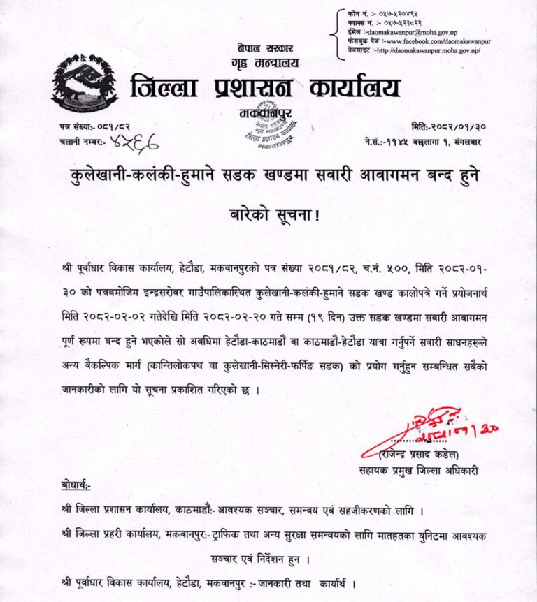 जिल्ला प्रशासन कार्यालय मकवानपुरले जारी गरेको सूचनामा लेखिएको छ, ‘इन्द्रसरोवर गाउँपालिकास्थित कुलेखानी–कलंकी–हुमाने सडकखण्ड कालोपत्रे गर्ने प्रयोजनार्थ मिति २०८२–०२–०२ गतेदेखि मिति २०८२–०२–२० गतेसम्म (१९ दिन) उक्त सडकखण्डमा सवारी आवागमन पूर्णरुपमा बन्द हुने भएकोले सो अवधिमा हेटौंडा–काठमाडौं वा काठमाडौं–हेटौंडा यात्रा गर्नुपर्ने सवारी साधनहरुले अन्य वैकल्पिक मार्ग (कान्ति लोकपथ वा कुलेखानी–सिस्नेरी–फर्पिङ सडक) को प्रयोग गर्नुहुन…।’