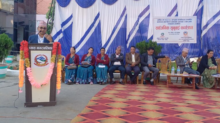 नगरवासीको गुनासोलाई कर्मचारी र जनप्रतिनिधि समक्ष पु¥याई शुसासन कायम गर्न व्यास नगरपालिकाको कार्यालयको सहकार्यमा सार्वजनिक सुनुवाई गरिएको नेपाल पत्रकार महासंघ तनहुँका अध्यक्ष डिपि अधिकारीले बताउनुभयो ।