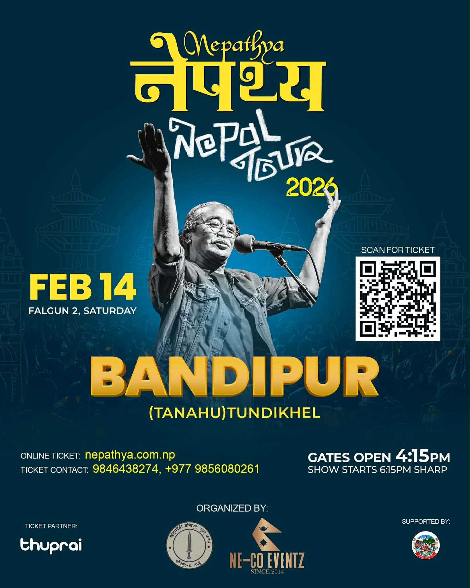 तनहुँको पर्यटकीय स्थल बन्दिपुरमा नेपथ्यको लाईभ कन्सर्ट हुने भएको छ । निको इभेन्टको आयोजनामा अगामी फागुन २ गते भ्यालेन्टाईन डे को अवसरमा सो कन्सर्ट हुन लागेको हो ।