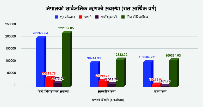 नेपालले तिर्न बाँकी सार्वजनिक ऋण रू २२ खर्ब २१ अर्ब ६७ करोड ८५ लाखभन्दा बढी पुगेको छ । सार्वजनिक ऋण व्यवस्थापन कार्यालयले सार्वजनिक गरेको तथ्याङ्कअनुसार गत आर्थिक वर्ष २०७९/८० को अन्तसम्ममा नेपालले रू ११ खर्ब २८ अर्ब ३२ करोड ९२ लाख बराबर आन्तरिक र रू १० खर्ब ९३ अर्ब ३४ करोड ९३ लाख बराबर बाह्य ऋण तिर्न बाँकी रहेको देखिएको हो । गत आर्थिक वर्षमा मात्र नेपालको सार्वजनिक ऋण रू दुई खर्ब आठ अर्ब ३८ करोड २१ लाख थपिएको छ । अघिल्लो आर्थिक वर्ष २०७८/७९ को असार मसान्तसम्ममा यस्तो ऋण रू २० खर्ब १३ अर्ब २९ करोड ६४ लाख बराबर थियो । गत आर्थिक वर्षमा मात्र रू एक खर्ब ४० अर्ब ८७ करोड ९९ लाख बराबर आन्तरिक र रू ६७ अर्ब ५० करोड २२ लाख बराबर बाह्य ऋण थपिएको सार्वजनिक ऋण व्यवस्थापन कार्यालयले जनाएको छ ।