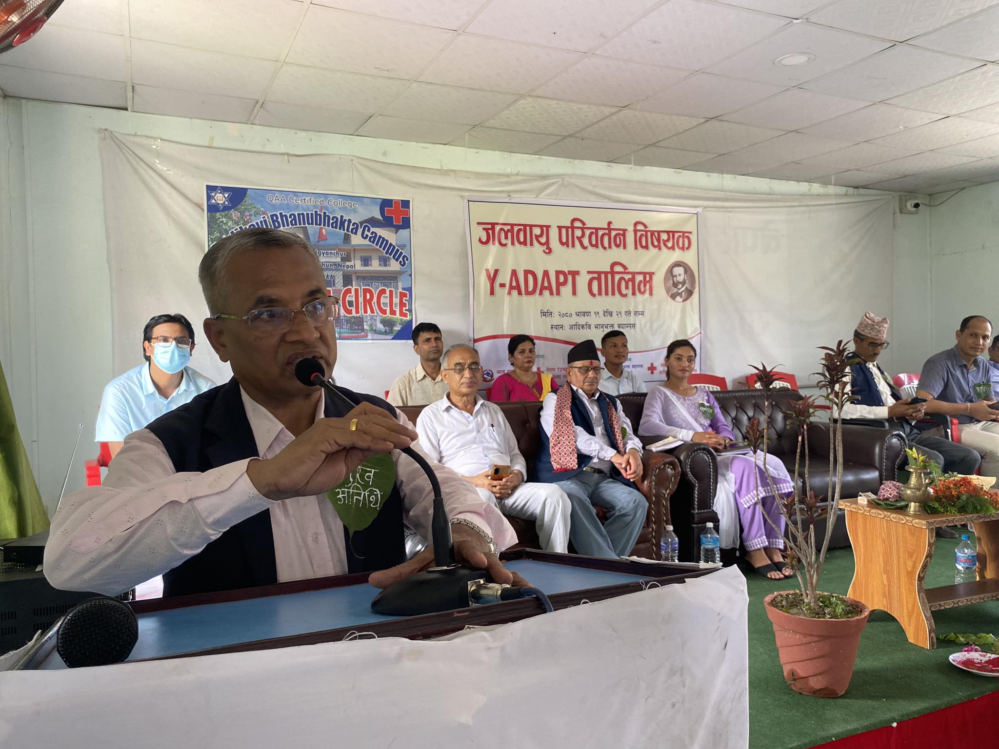 तनहूँको व्यास नगरपालिका वडा नं १ स्थित रहेको आदीकवि भानुभक्त क्याम्पसमा नेपाल युवा रेडक्रस सर्कलको आयोजनामा जलवायु परिर्वतन सम्बन्धी तालिम सुरु भएको छ । तालिमको उद्घाटन गदै व्यास नगरपालिकाका प्रमुख वैकुण्ठ न्यौपानेले जलबायू परिवर्तनले ल्याएको जटिलता लाई सबैले मनन गर्ने जनस्तरमा सचेतना बृद्धि गर्नु अनिवार्य रहेको बताए । उनले युवाहले नै समाजमा सकरात्मक सन्देश फैलाउन मद्धत पुयाउने समेत बताए । नेपाल रेडक्रस सोसाईटिका केन्द्रिय सदस्य एवं तनहुँ रेडक्रसका सभापति प्राडा कृष्ण प्रसाद गौतमले जलवायु परिर्वतनले देखिएका रेडक्रसले युवाह?लाई तालिम प्रदान गदै सचेतना फैलाएको बताए ।