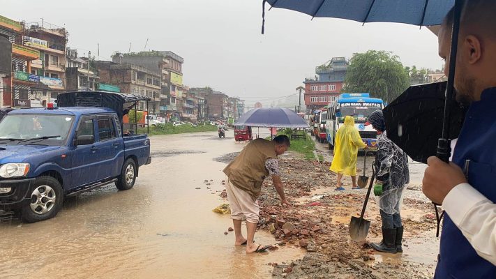 पोखरा– मुग्लिङ सडक खण्ड चार लेनको निर्माण गर्ने क्रममा पृथ्वीराजमार्गको ढल निकासको नाला भत्किएपछि गएराति देखि परेको अविरल पानीले दमौली बजार जलमग्न बनेको छ । मुख्य सडक र सहायक सडकमा पानी भरिएर सडक छेउका घर र पसलमा पानी पसेको थियो । त्यसपछि नगरपालिकाको जेसिबी र ट्रयाक्टर प्रयोग गरेर ढल व्यवस्थापन गरि पानीको निकास गरिएको छ । नगर उपप्रमुख इन्दिरा दरै र वन वातावरण तथा विपत् व्यवस्थापनका संयोजक रणसिं नेपालीको नेतृत्वमा जलमग्न बनेको तरकारीलाईनमा बिहान देखिनै जेसिबी र ट्रयाक्टर प्रयोग गरेर ढल व्यवस्थापन गरि पानीको निकास गरिएको हो । सडक विस्तारको क्रममा सडक डिभिजनले राजमार्गको सडकको पानीको उचित निकास व्यवस्थापन हुन नसक्दा यस्तो समस्या भएको बताईएको छ । उपप्रमुख इन्दिरा दरैले भनिन्,“राजमार्ग विस्तारको क्रममा छ, सडक विभागले हेर्नुपर्ने हो । अहिले तत्कालको लागि अस्थायी रुपमा ढलको निकास गरिएको छ । ” नगरपालिकाका सहायक ईन्जिनियर प्रदिप पौडेलले राजमार्ग विस्तारको क्रममा नालामा रहेको ह्युमपाइप बन्द भएपछि पानीको निकास बन्द भएको बताए । उनले भने,“राजमार्ग विस्तारको क्रममा नालीहरु भत्किएका छन्, जसले गर्दा पानीको उचित निकास हुन सकेको छैन । ” उनका अनुसार जेसिबीबाट पानीको निकास गरिएपछि तत्कालका लागि समस्या हटेको छ ।