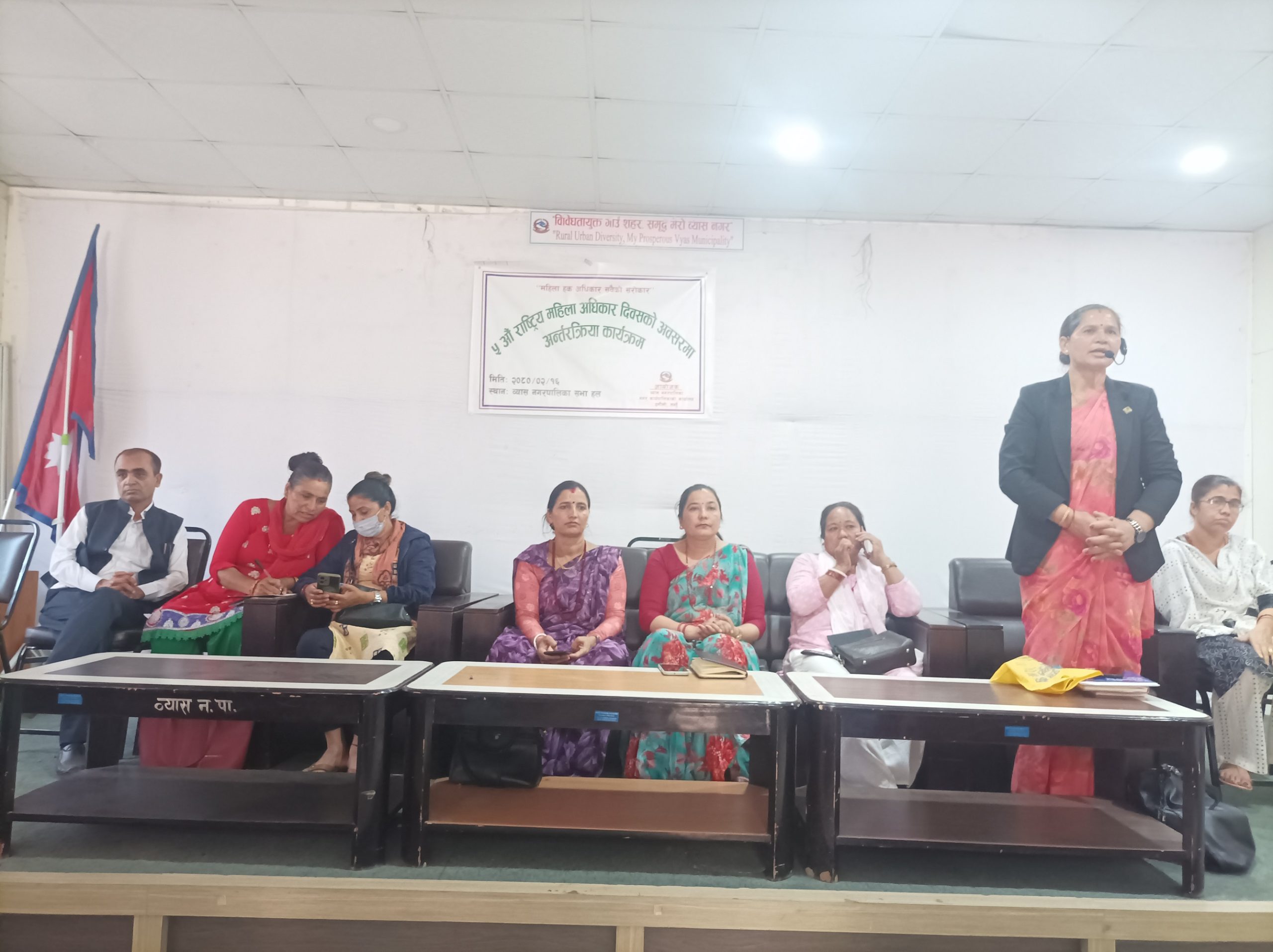 महिलाको हक अधिकार सबैको सरोकार’ भन्ने मुल नारा सहित ५ औँ राष्ट्रिय महिला अधिकार दिवस मंगलबार दमौलीमा सम्पन्न भएको छ । कार्यक्रमको प्रमुख अतिथि व्यास नगरपालिका प्रमुख बैकुण्ठ न्यौपानेले कार्यलयहरुले प्रदान गरिने सेवा सुविधामा महिलाहरुलाई बन्चित नभएता पनि गाँउ गाँउ तिर महिलाहरुको आफ्नो हक अधिकारबाट बन्चित हुनु परेको बताउनु भएको छ । महिलाहरुको हक अधिकारका लागि स्थानिय तहमा महिला जनप्रतिनिधि रहेको र आफ्नो समस्यहरु खुलेर राख्न सके महिलाहरु बन्चित हुन नपर्ने समेत बताउनुभयो । त्यस्तै उपमेयर इन्दिरा दरैले एक वर्षमा ९४ वटा मुद्दा दर्ता भएको र यस मध्य धरै महिला हिसां रहेको बताउनुभयो । कार्यक्रमको प्रशिक्षण अधिभक्त सरिता भन्डारीले गर्नु भएको थियो । उहाँले महिलाहरूले राज्यबाट पाएको अधिकार बारे व्याख्या गर्नुभएको थियो । कार्यक्रममा शिक्षा तथा समाजिक प्रमुख नवीन पराजुलीले महिलहरूले भोगेका समस्या लाई न्युनिकरण बारे चर्चा गर्नुभएको थियो । साथै उक्त कार्यक्रमा विभिन्न संघ सस्थाका महिला प्रतिनिधिहरुको उपस्थित रहेको थियो ।