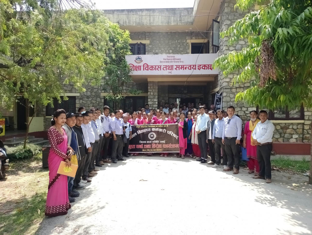 नेपाल विद्यालय कर्मचारी परिषद् जिल्ला कार्य समिति तनहुँले धर्ना गरेका छन् । नेपाल सरकारको नीति तथा कार्यक्रमको बुदा नं १२७ मा समेत उल्लेख भएको तर बजेटमा नसमेटिएको भन्दै कर्मचारीहरुले विहिबार शिक्षा समन्वय इकाई तनहुँमा धर्ना गरेका हुन् । नेपाल विद्यालय कर्मचारी परिषद राष्ट्रिय समितिका केन्द्रीय महासचिव शान्तिनाथ योगि र अध्यक्ष गंगाराम तिवारीले प्रेस विज्ञप्ती जारी गर्दै देशभरका विद्यालय कर्मचारी चरणबद्ध आन्दोलनमा उत्रिएको जनाएका छन् । जेठ २० देखि २६ गतेसम्म विद्यालयको ताला चावी बुझाई सम्पूर्ण विद्यालय कर्मचारीहरु धर्ना गरेका हुन् । जेठ २० गतेदेखि आन्दोलन शुरु भएको असार २ गते देखि देशभरका विद्यालय ठप्प पार्ने चेतावनी समेत दिएका छन् ।