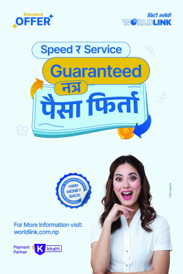 वल्र्डलिंकले ग्राहकलाई ढुक्क बनाउने ‘सर्भिस ग्यारेन्टी’को सुविधा ल्याएको छ । निजी क्षेत्रको सबैभन्दा ठुलो इन्टरनेट सेवा प्रदायक वल्र्डलिंक कम्युनिकेशन्सले इन्टरनेटको स्पिड स्लो भए पैसा फिर्ता दिने आकर्षक सुविधा ल्याएको हो।