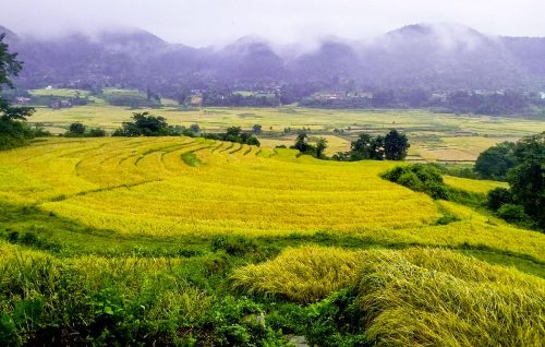 तनहुँको व्यास नगरपालिका–५ स्थित साँगेफाँटको धानबालीमा वर्षाले क्षति पुर्याएको छ । धान बाली पाकेर भित्र्याउने बेलामा पानी परेपछि यहाँका किसान चिन्तित भएका छन् । तस्बिर: रासस