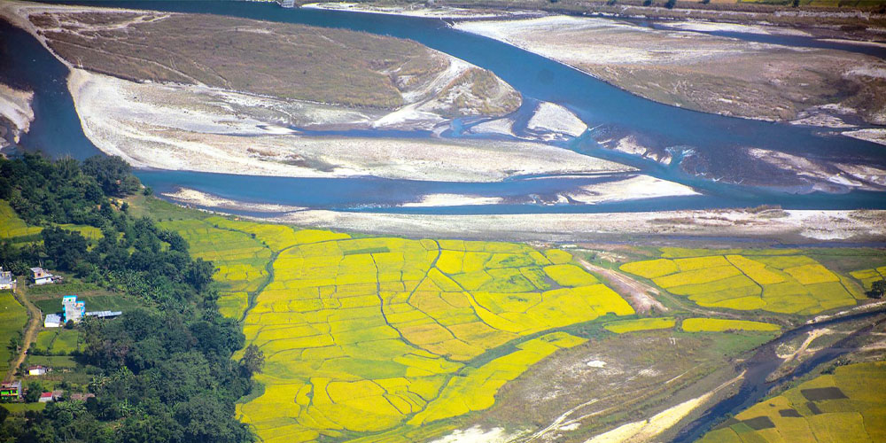 तनहुँको व्यास नगरपालिका–५ स्थित मादी नदी र सँगै रहेको पतेनीको धान फाँट । तस्बिरः रासस