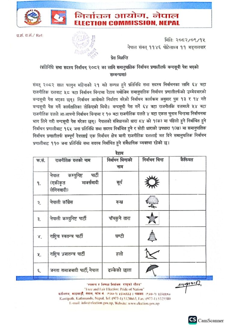‘बन्दसूची पेस गर्ने ६४ वटा राजनीतिक दलमध्ये ५४ वटा राजनीतिक दलले आआफ्नो निर्वाचन चिह्नमा र १० वटा दलले चार वटा एकल चुनाव चिह्नमा निर्वाचनमा भाग लिने गरी बन्दसूची पेस गरेका छन्’, प्रवक्ता भट्टराईले भने,‘समानुपातिकतर्फ ११० जना निर्वाचित हुनेछन् ।’