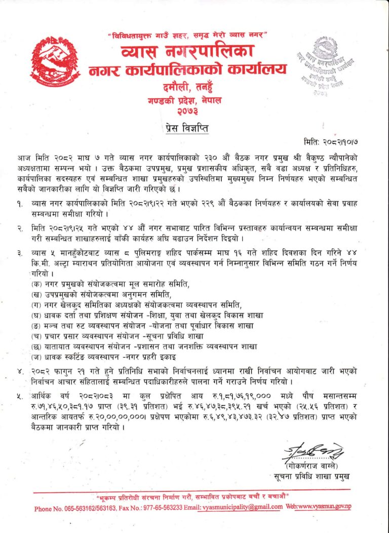 व्यास नगरपालिकाले आगामी माघ १६ गते आयोजना गर्ने अल्ट्रा म्याराथन प्रतियोगिता सम्पन्न गर्न विभिन्न समितिहरू गठन गरेको छ ।व्यास नगरपालिका नगर कार्यपालिकाको बुधबार बसेको कार्यपालिकाको बैठकले व्यास नगरपालिका–५ मानुङकोटबाट व्यास नगरपालिका–८ पुलिमराङ सहिद पार्कसम्मको ४४ किलोमिटर अल्ट्रा म्याराथनका लागि विभिन्न समिति गठन गर्ने निर्णय गरेको हो । म्याराथनका लागि नगर प्रमुख वैकुण्ठ न्यौपानेको संयोजकत्वमा मूल समारोह समिति गठन गरिएको छ ।