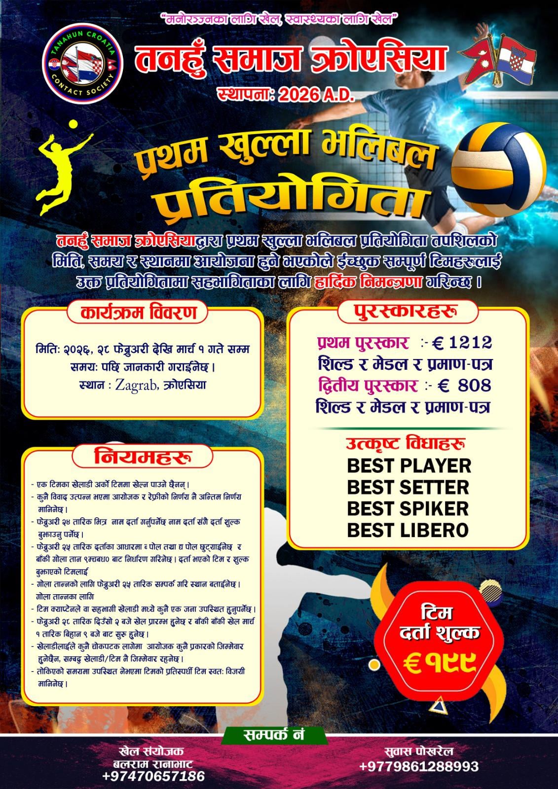 क्रोएसियामा प्रथम खुल्ला भलिबल प्रतियोगिता २०२६ हुने भएको छ । तनहुँ समाज संघ राष्ट्रिय कर्मचारी समिति क्रोएसियाको आयोजामा खुल्ला भलिबल प्रतियोगिता हुने भएको हो ।